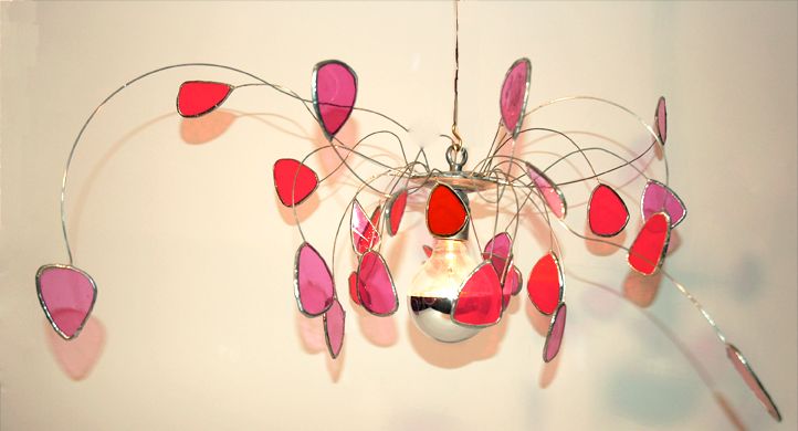 Entre nature et technologie le coeur de cette lampe vacille, les pétales de vitrail fleurissent comme des antennes désordonnées, les éclats de rouge et de rose papillonnent gaiement autour du luminaire.